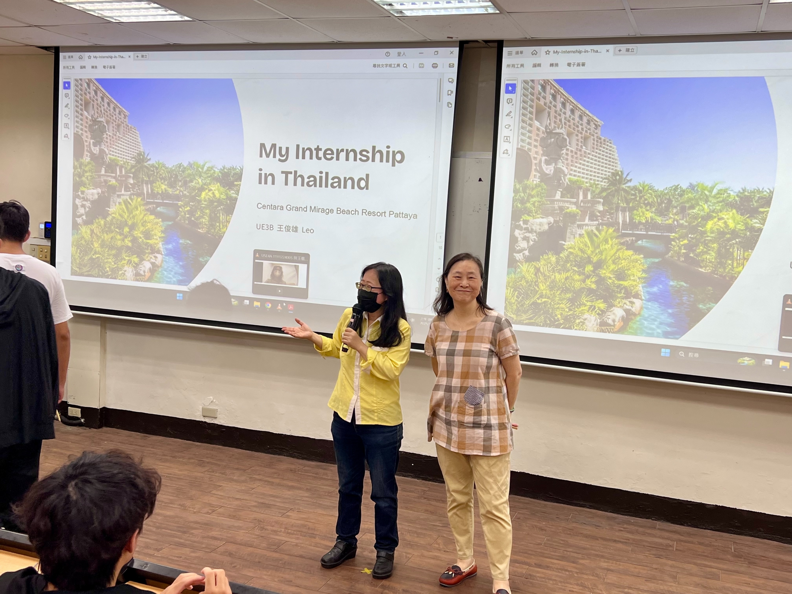 學院於10月2日舉辦「泰國實習分享會」,由院長及麗英老師開場,向同學們介紹英文系多元的海外實習機會,並鼓勵大家踴躍參與。分享者包括東南亞系的玉凰、英文系的 Leo,以及五專英文科的 Halina。玉凰透過實習提升了泰文與英文能力,並體會到跨語言服務的挑戰與成長;Leo 因對泰國文化的熱情投入實習,分享了在餐飲服務中的學習與收穫,強調開放心態與情緒管理的重要;Halina 則在飯店前台實習,透過實務操作增進專業,並首次體驗領薪水的喜悅。三位同學的經驗不僅展現了跨文化交流的價值,也激發在場學生對未來國際實習的期待。