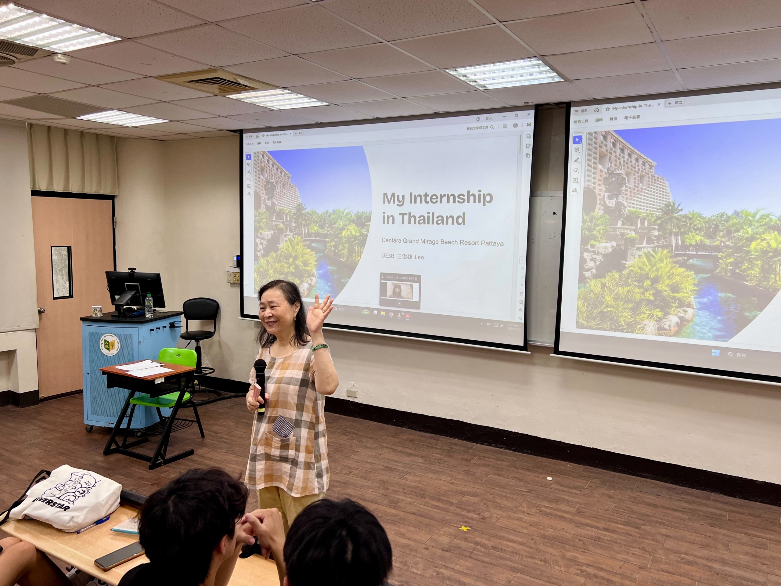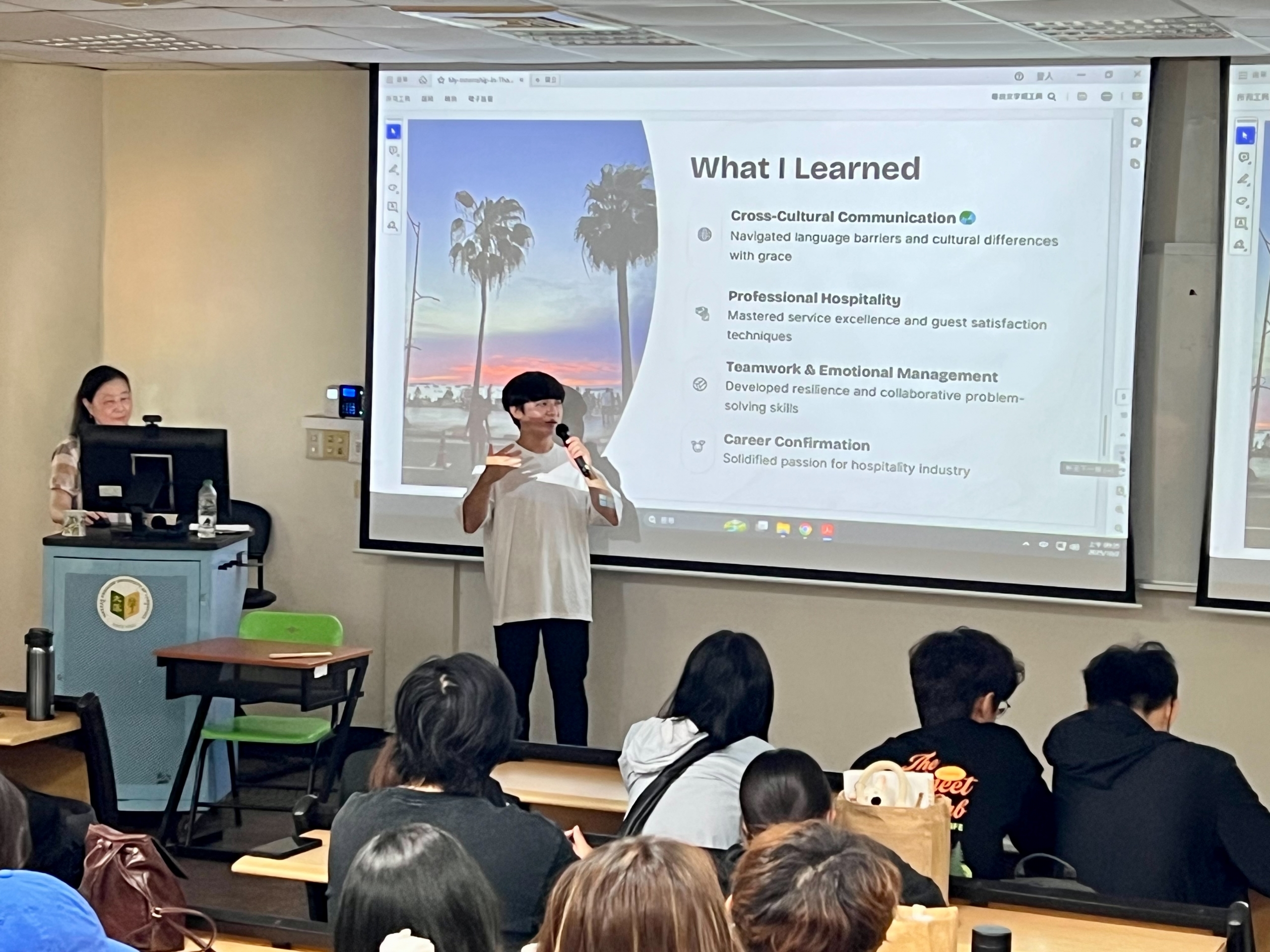 Three students shared their experiences in Thailand. Yu-Huang, a student from the Southeast Asian Studies Department majoring in Thai, spoke about overcoming nervousness when communicating, often switching between Thai and English, which significantly improved her language abilities. Leo from the English Department shared his interest in Thai culture, his work experience in the F&B department, and what he learned from serving VIP customers. He emphasized the importance of being open-minded, managing emotions, and embracing challenges. Halina, from the Five-Year Junior College of English Department, described her role at the hotel front desk, where she updated guest information and provided on-site translation. She expressed her excitement at receiving her first paycheck and highlighted how the internship enhanced her skills through “learning by doing.”