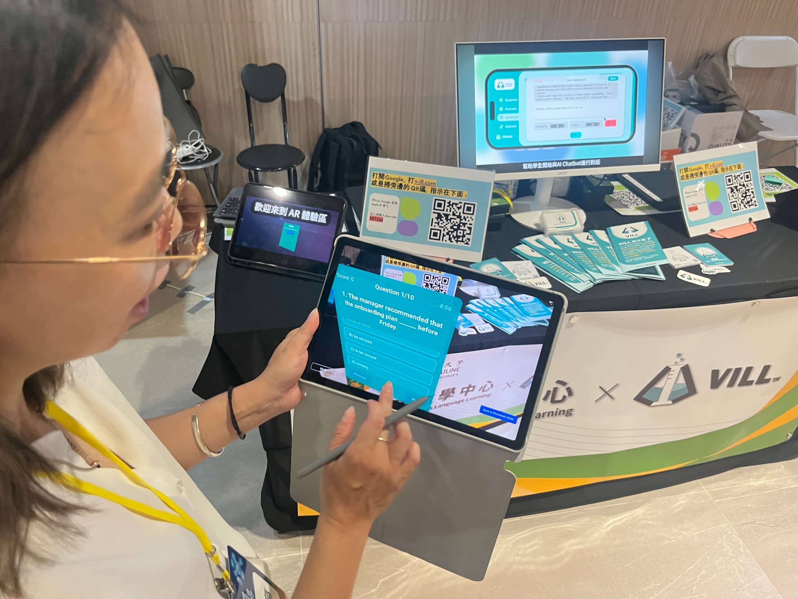 At the event, Dr. Chang Hui-Hsiang, Director of the English Teaching Center under the International College, together with Professor Chen Hung-Yu, the project leader, and her team, introduced the VILL platform. The system integrates AI conversational bots with AR interactive features, transforming teacher-created materials into intelligent digital content that provides instant and personalized feedback, effectively enhancing students’ language performance and intercultural communication skills.