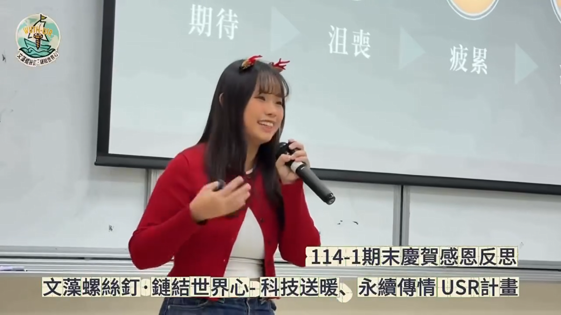 課堂之外,張同學的表現同樣令人印象深刻。她分享自己早在國中時期,便因參與兒少代表甄選加入人本教育文教基金會,並擔任教育組組長,開始接觸公共議題與記者會實務;此後亦曾主持台中捷運記者會及企業活動,累積豐富的舞台經驗與溝通能力。這些經驗也在「小小螺絲釘」計畫期末成果發表中獲得充分展現,她擔任活動主持人,表現沉穩大方、掌控流程得宜,獲得師長與團隊一致肯定。這些看似與課堂學習無直接關聯的歷程,卻成為她在 USR 課程中展現高度參與度與即時應變能力的重要養分。